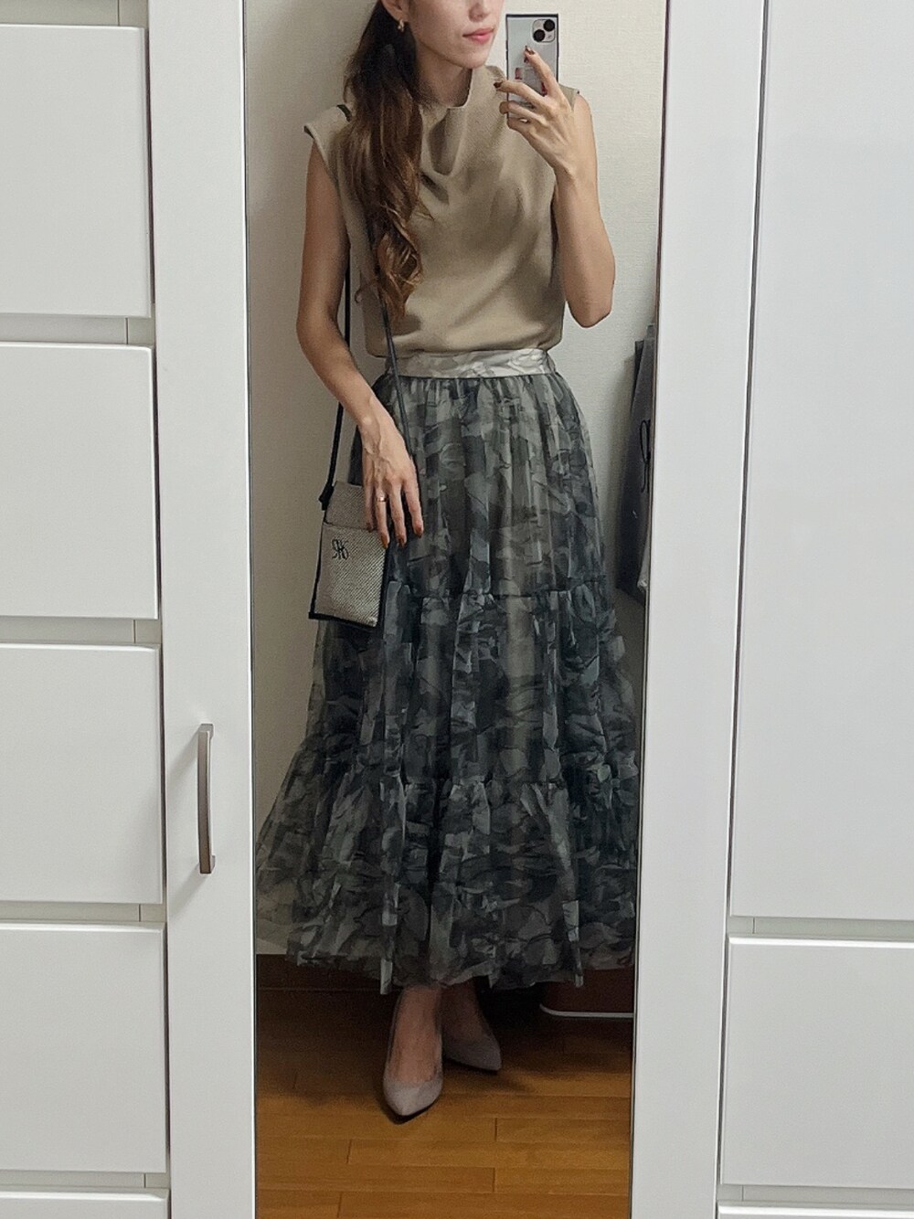 暑さが戻ってきた時用に購入した、新作のトップス! 襟がどこにあればいいかわかんない系のやつで難しいけど😂😂 柔らかい生地でとっても着やすい🤎 スカートもずっと欲しかったのをついに🥺🤎 柄の落ち着いた色味のチュールスカートで夏から秋にピッタリ!!