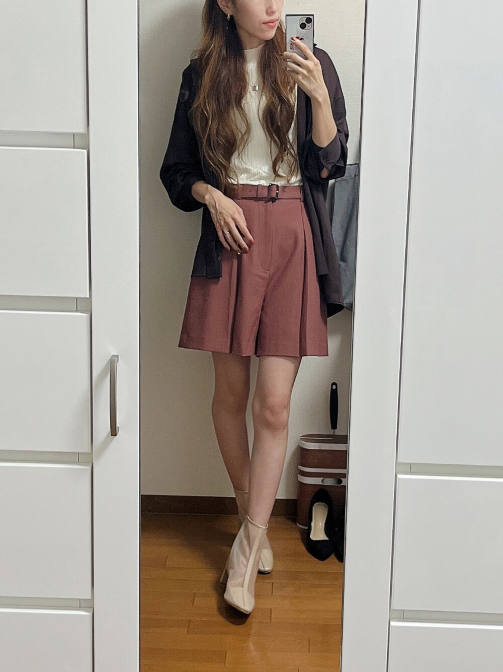 肌寒くてシャツを羽織って♫ 濃いめの秋カラー🤎 ショートパンツもダークピンクで一気に秋感🍁
