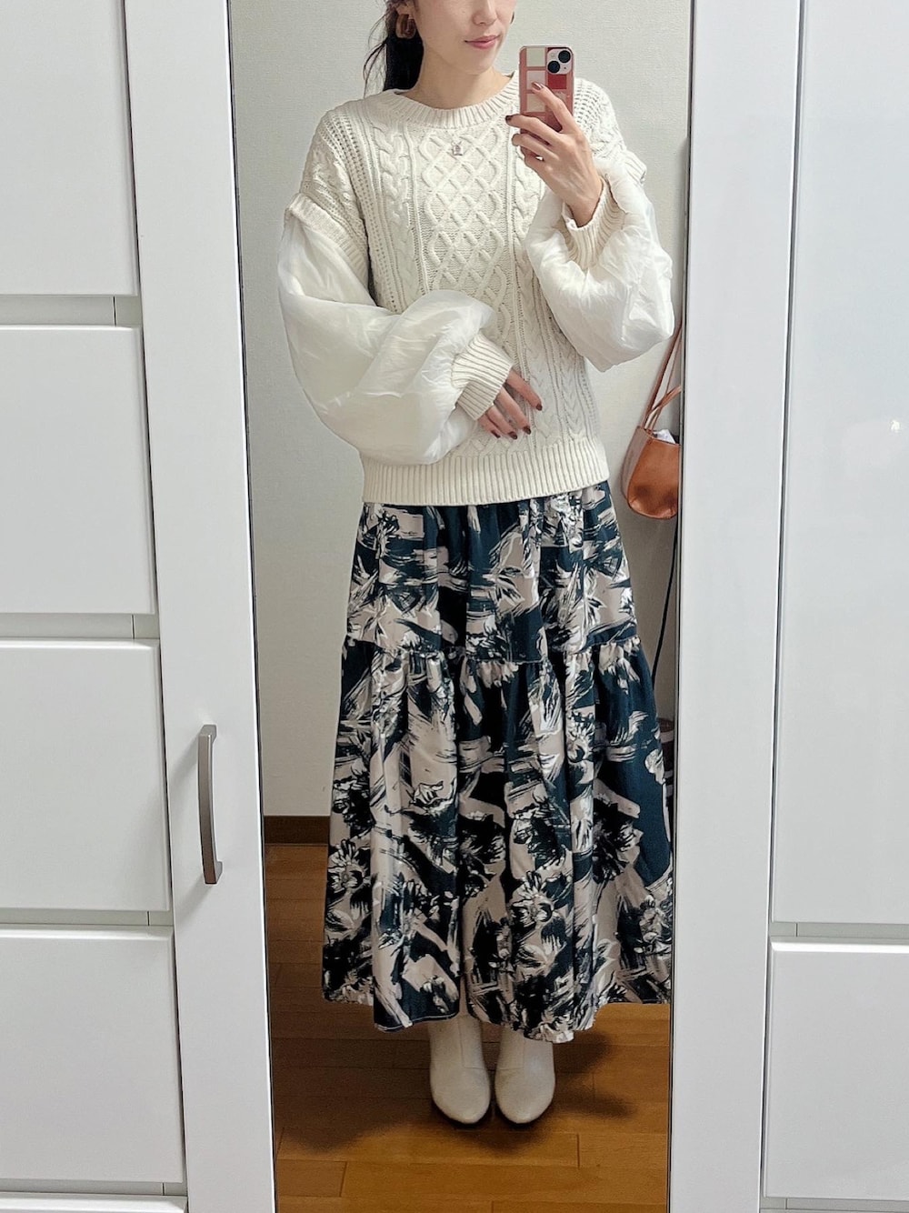 saaaya_codeのニット/セーター「オーガンジードッキングケーブルニット」を使ったコーディネート
