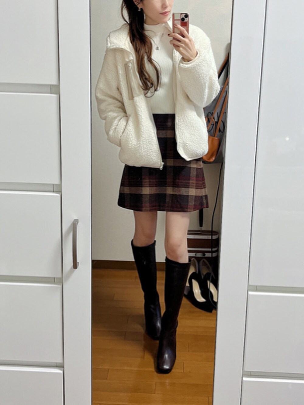 王道モテコーデ🤎 この間はブラックできれいめに合わせたけど、今日はホワイトのもこもこで🐑♡ ホワイトニット×ミニスカート×ロングブーツは完璧だと思う😮💨🤎