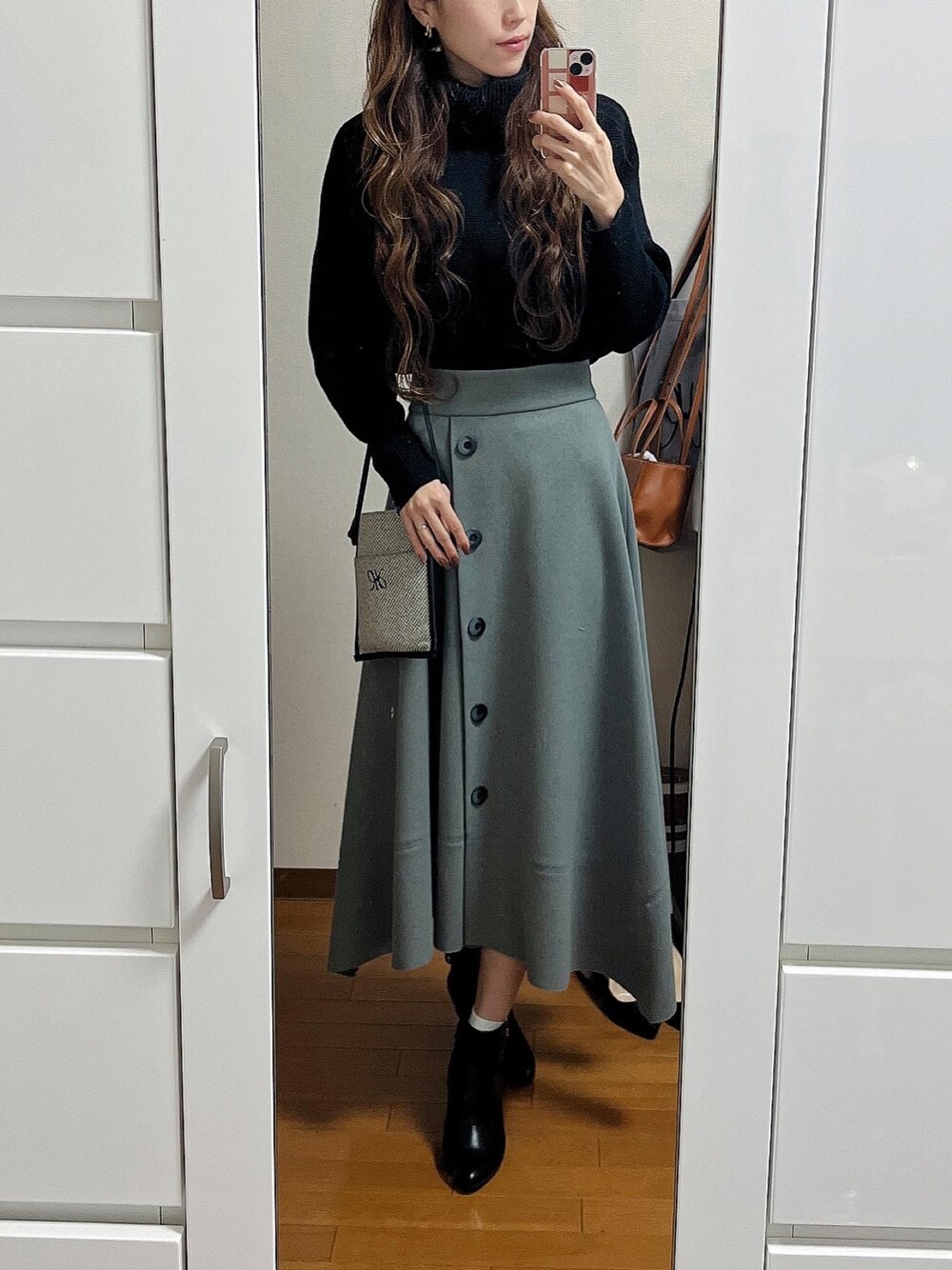 なんかものすごく寒くてあったかコーデ。 タートルネックニットとウールのスカートであったかく☺️