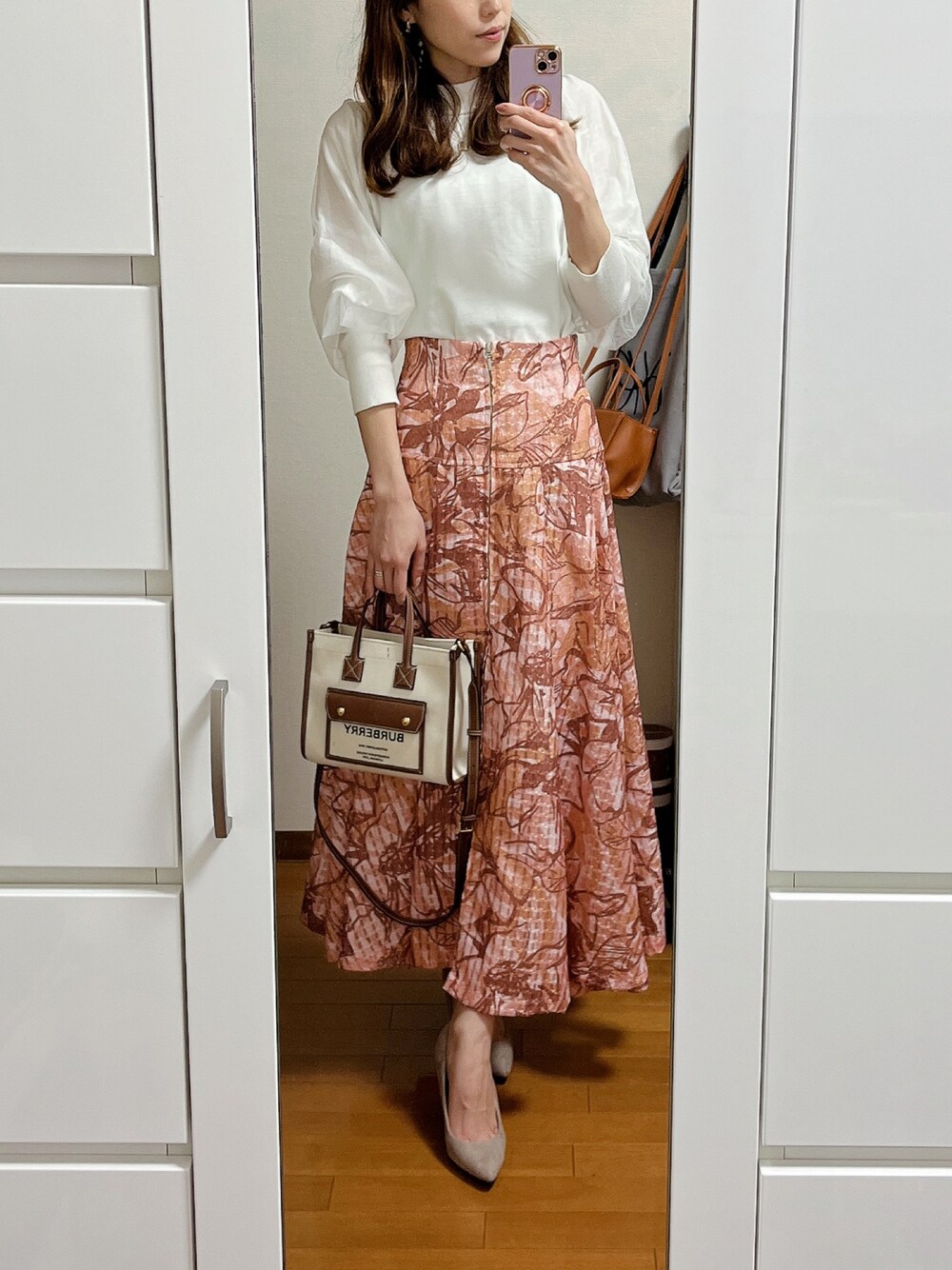 ラスト父母会コーデはオレンジのスカートで春らしく🌸 ヒートテックなしでも薄手のニットがちょうどいい季節になってワクワクする♫ 袖部分がちょっとシアー感あるけど、それでも寒くなくいられるとっても過ごしやすい季節🥰🥰