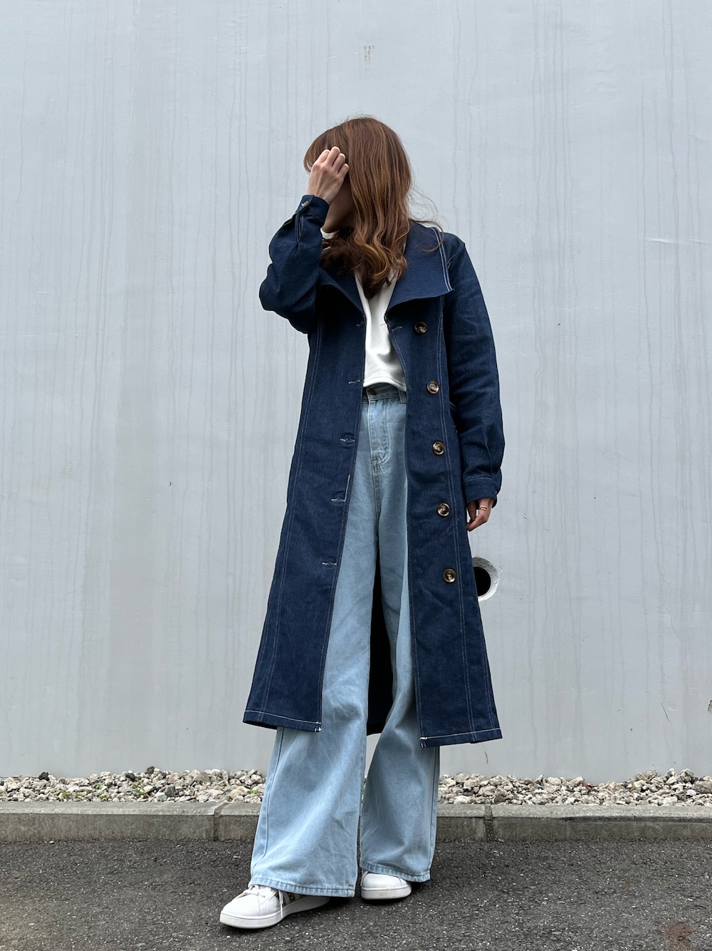 コート購入する時に絶対やりたいと思っていたコーデ! 色味の違うデニムのワイドパンツにデニムのトレンチコート、やっぱりかわいかったー💙