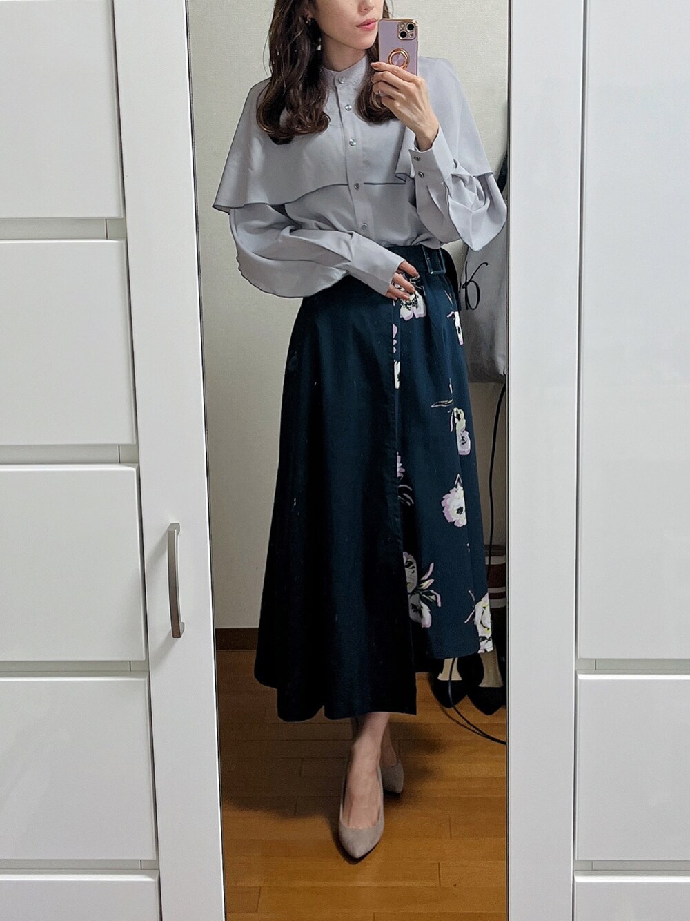 ブルー系が気になる今日この頃… くすみブルーのブラウスを購入していたので初おろし! 襟のフリルがお袖にまで繋がってて、珍しいデザインで好き🥰🥰 グレーに近いようなこの色味も、大きめのフリルだけど大人っぽく着られて良き◎