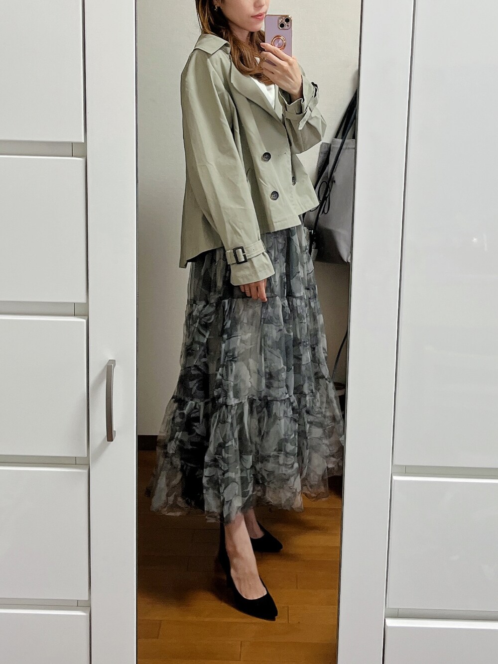 朝はまだ肌寒くてショート丈のトレンチコート♫ カーキの色味にグリーンのチュールスカートでワントーンコーデ🌿