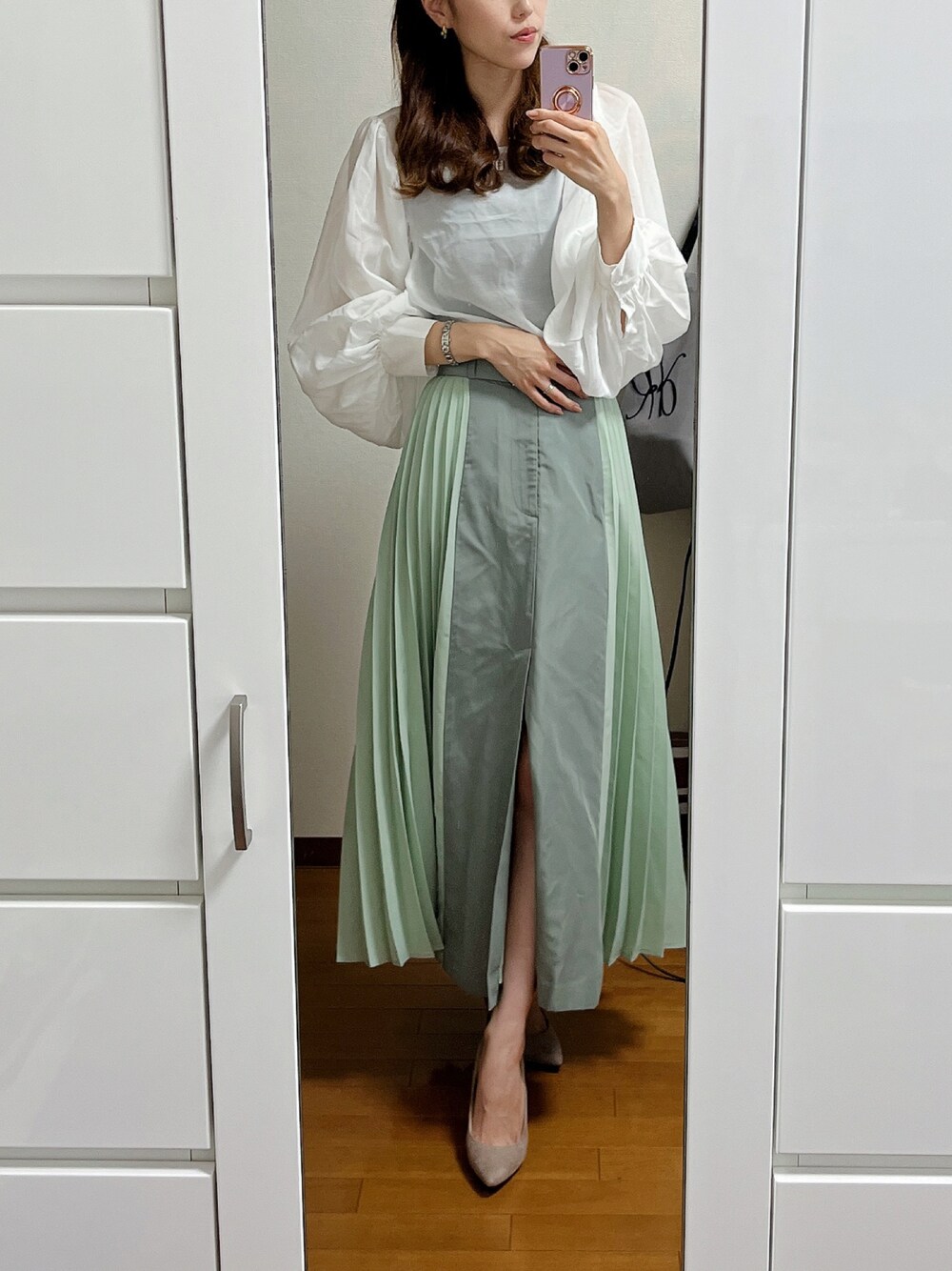 ホワイト×グリーンの淡色コーデ🌿 フロント部分にスリットが入ってて、そこ以外の横と後ろはプリーツになってて、ちょっと変わったデザインに一目惚れ🥰🥰