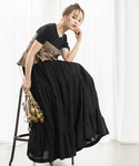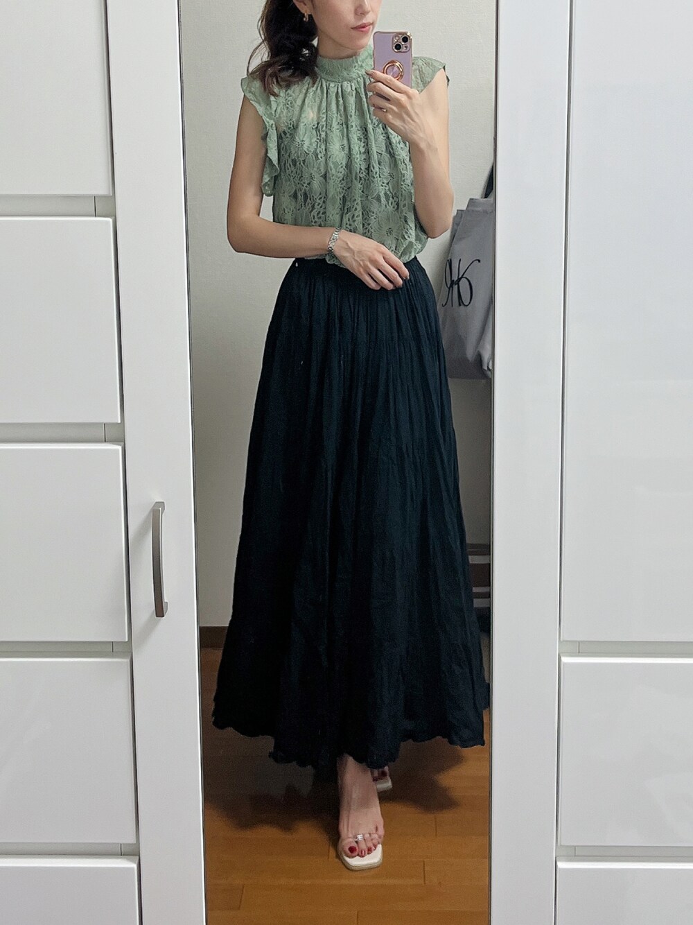 たっぷり生地のティアードスカート♫ ノースリーブに合わせることでブラックのロングスカートも重たく見えず! そして何よりクリアサンダルの抜け感の効果絶大。