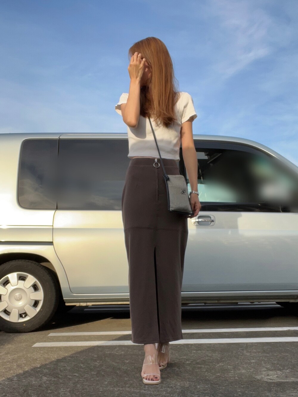 このスカート3色目🫢 カットソー生地で履き心地最高だし、深めのスリット入ってるけど中がパンツになってるからしゃがんでも大丈夫な安心なスカート🥰🥰 秋冬にも大活躍しそうなブラウンもイロチ買いしちゃった🤎 ニットに合わせたら絶対かわいい🥺🥺 早く寒くならないかなぁ。