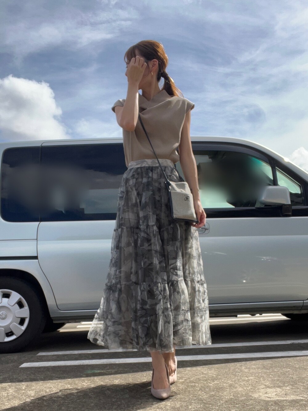 今日も暑くてもう何を着たらいいのか分からなーい🫠 ベージュのニットのノースリーブで秋を出しつつ涼しさも忘れずに、、 チュールスカートは濃いめのカラーに柄が入ってるから可愛らしさと大人っぽさを兼ね備えてて着やすいアイテム!