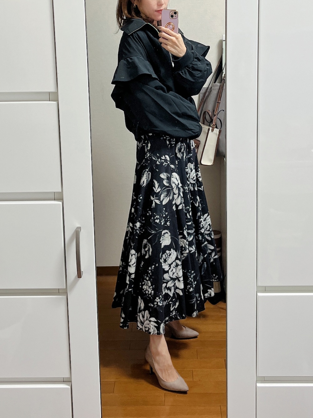 新しいブルゾンが届いたので、朝寒かったから早速♫ ブラックのブルゾンは重たくカジュアルになりがちだけど、袖がフリルになってるからきれいめコーデに合っちゃう◎ なんと取り外して半袖にも着れたりする優秀なアイテム☺️ モノトーンコーデに羽織ったら一気に秋らしくなりました🍂