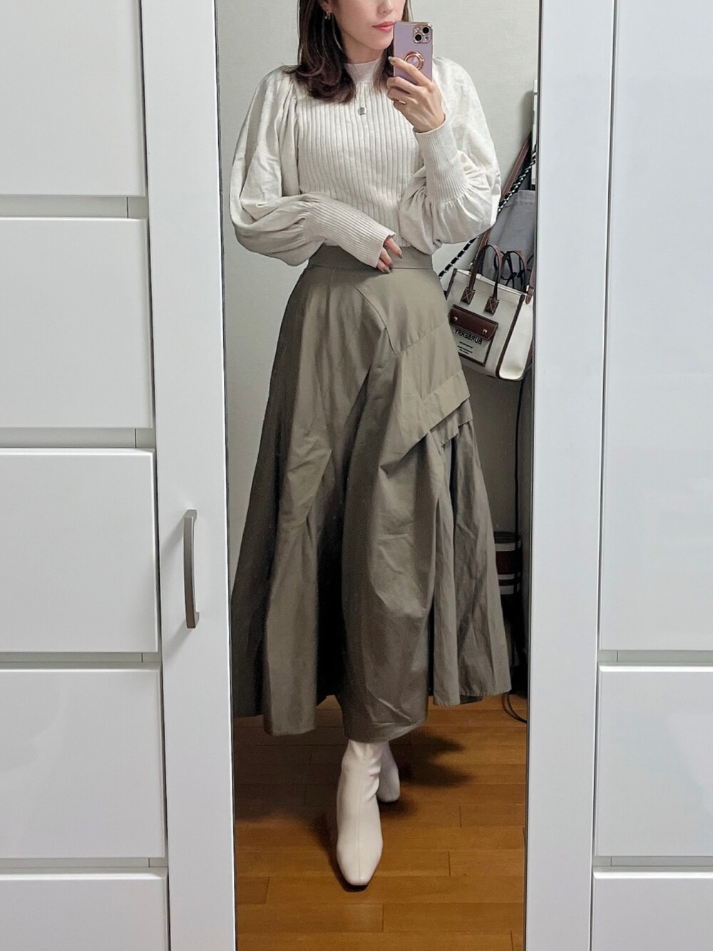 バタバタの朝でコーデ考える時間なくて、前に着ていた上下をまるっと採用🙆♀️ オートミールカラーのニットにカーキのスカートで、アースカラーコーデのできあがり♫