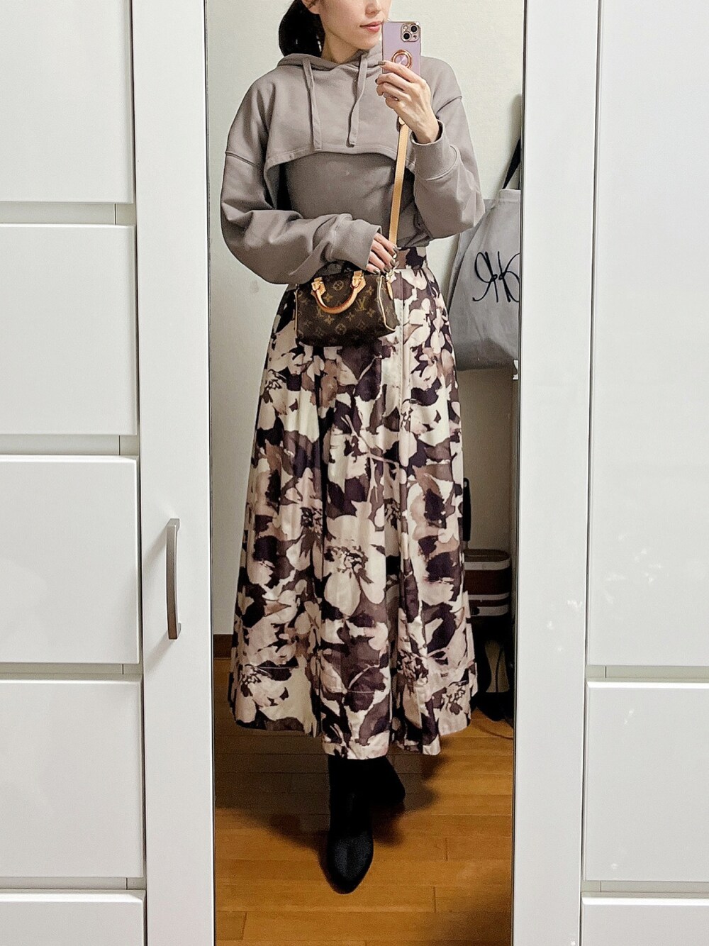 暖かそうだったから、クロップド丈のパーカーに花柄のスカートできれいめカジュアル♫ やっと今年初のスカート着られて満足🥰 やっぱりスカートの方が好き。
