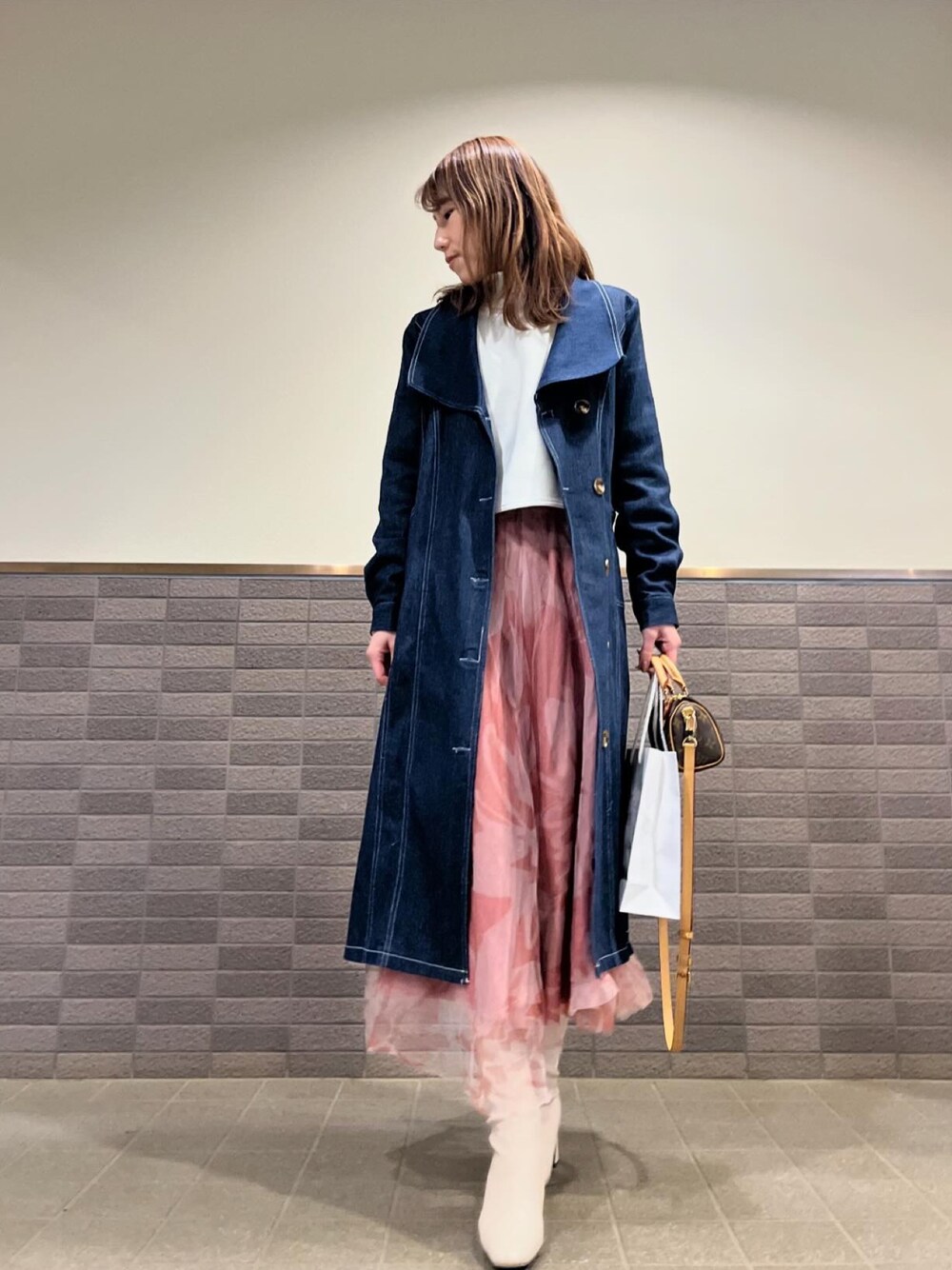 参観コーデは可愛らしい春コーデで🌸 ピンクの柄チュールスカートはもう何年も前のだけど、一気に春感出るお気に入りのアイテム🥰 ベージュのトレンチじゃなくてあえてデニムのトレンチでカジュアルさを出してみました♫