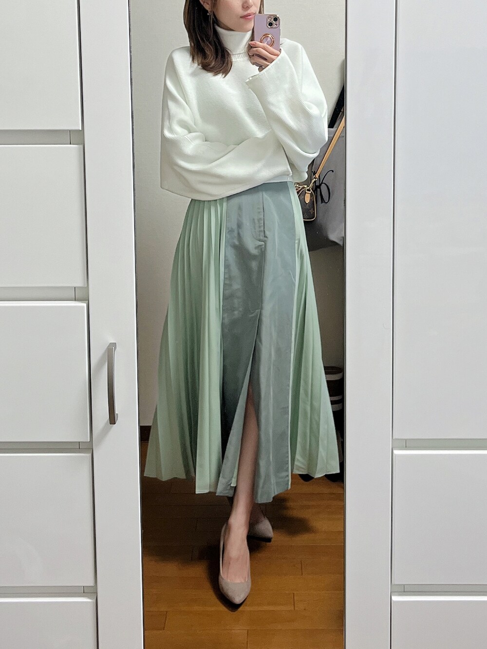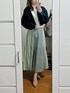 仲良しのママと朝コメダ☕️ またまた寒いけど、春カラーのプリーツスカートで春コーデ🌱 プリーツスカートってちょっと苦手だけど、これはフロントスリット入りだし、前の見えるところは別の張り感のある素材になってるから着れちゃう🫢💚