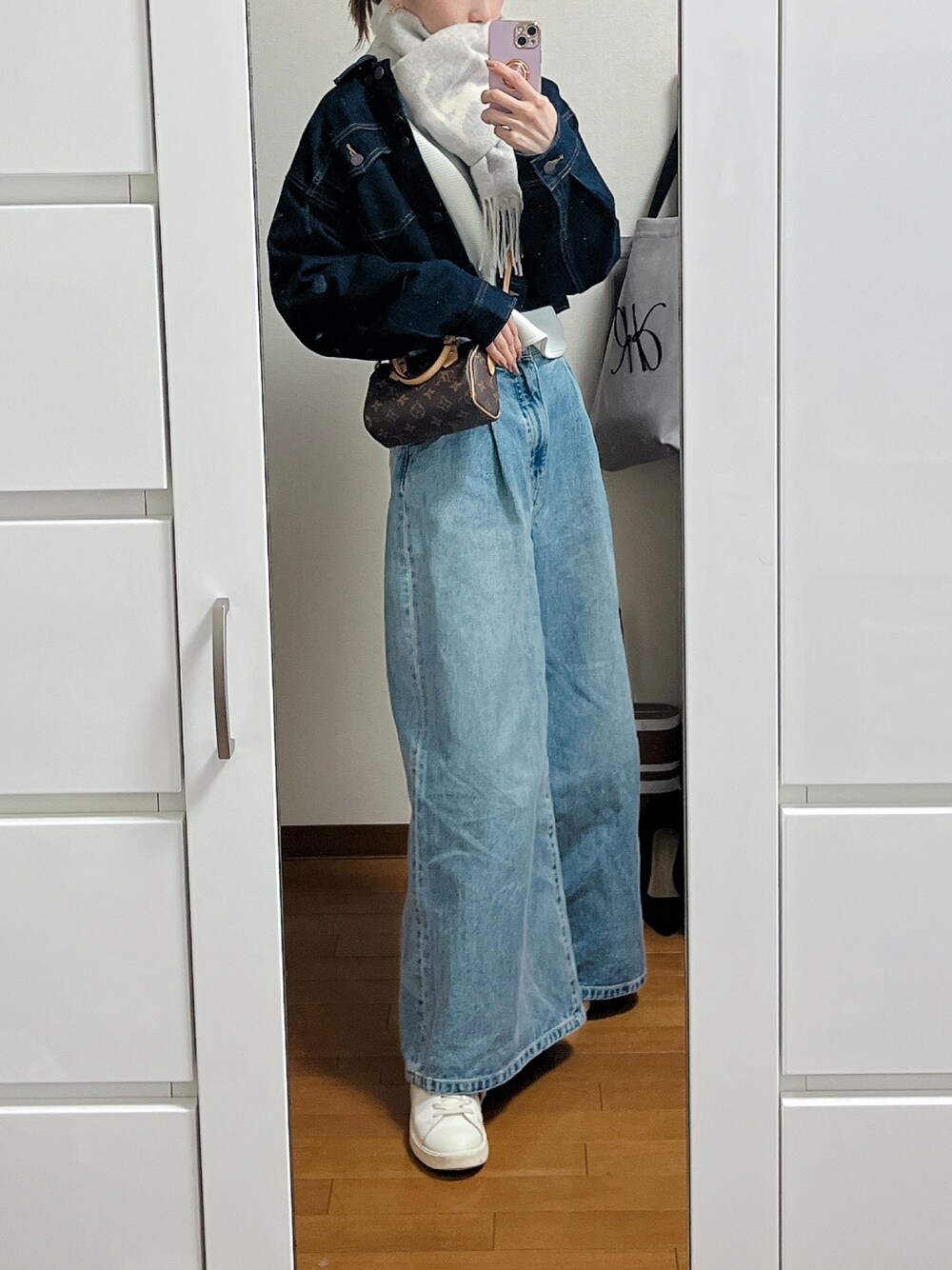 めちゃくちゃ寒いけどデニジャケ着たくてマフラーでカバー😂 色味の違うデニムで上下デニム! 完全なセットアップまではできないけど、色の濃淡が違えば合わせやすくできるデニムオンデニムが好き🥰🥰