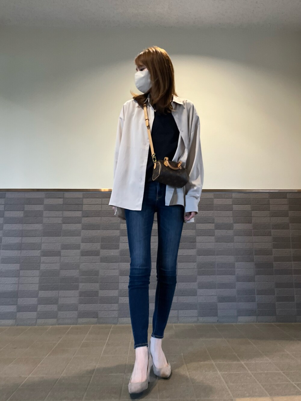 今季まだしてなかったシャツ×スキニー🫶 スキニーでヒップ隠れないのはそろそろ無理な気がしている今日この頃😂 ちょうど隠れるくらいのシャツの丈感が◎ シャツはカラーに丈感、いろんなバリエーションで持ってたい🫶