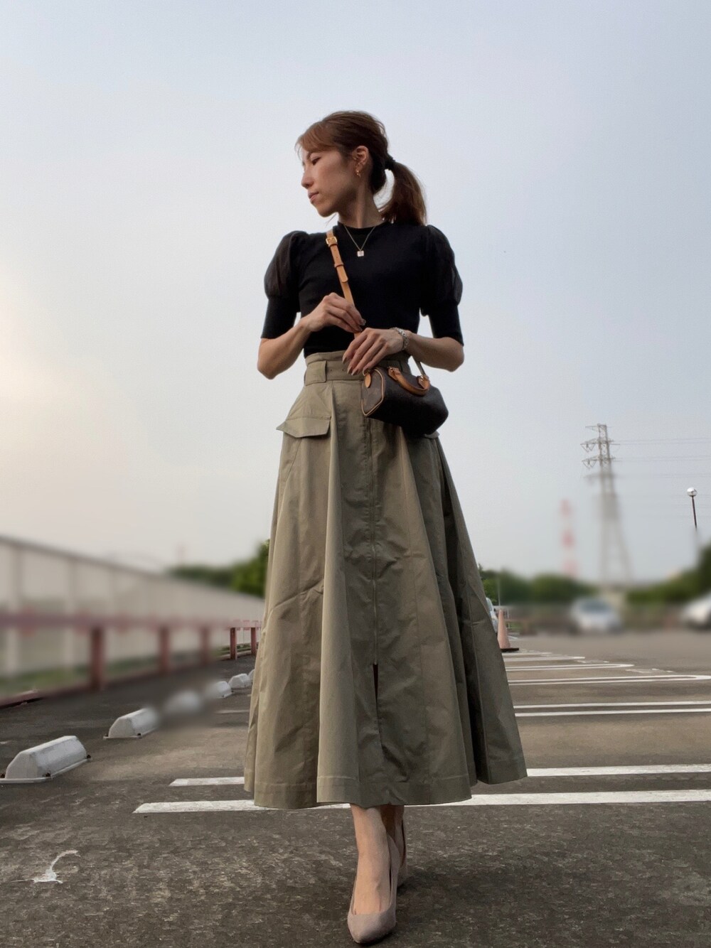 ブラック×カーキでシックに♫ 袖のシアー素材との切り替えがお気に入りのトップス🥰