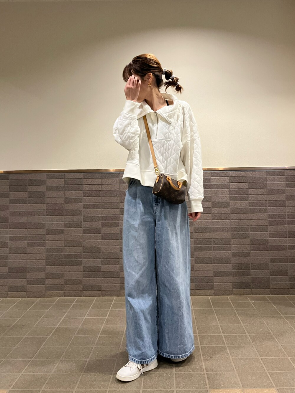 キルティングトップスで秋コーデ🍂 全然寒くならないけど、さらっと長袖1枚では過ごせる気温に♫ ふわっとしたタイトなものじゃないけど、広めのワイドパンツと合わせて、ゆるゆるとタボっと感でよりカジュアルさを◎