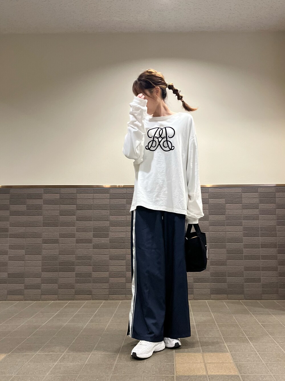 購入してたけどタイミング逃して着れていなかったロンT♡ ロエベみたいなriendaのロゴがかわいい🥰 トラックパンツ長すぎて、ロンTの下で実はウエスト1折りしてます🤫