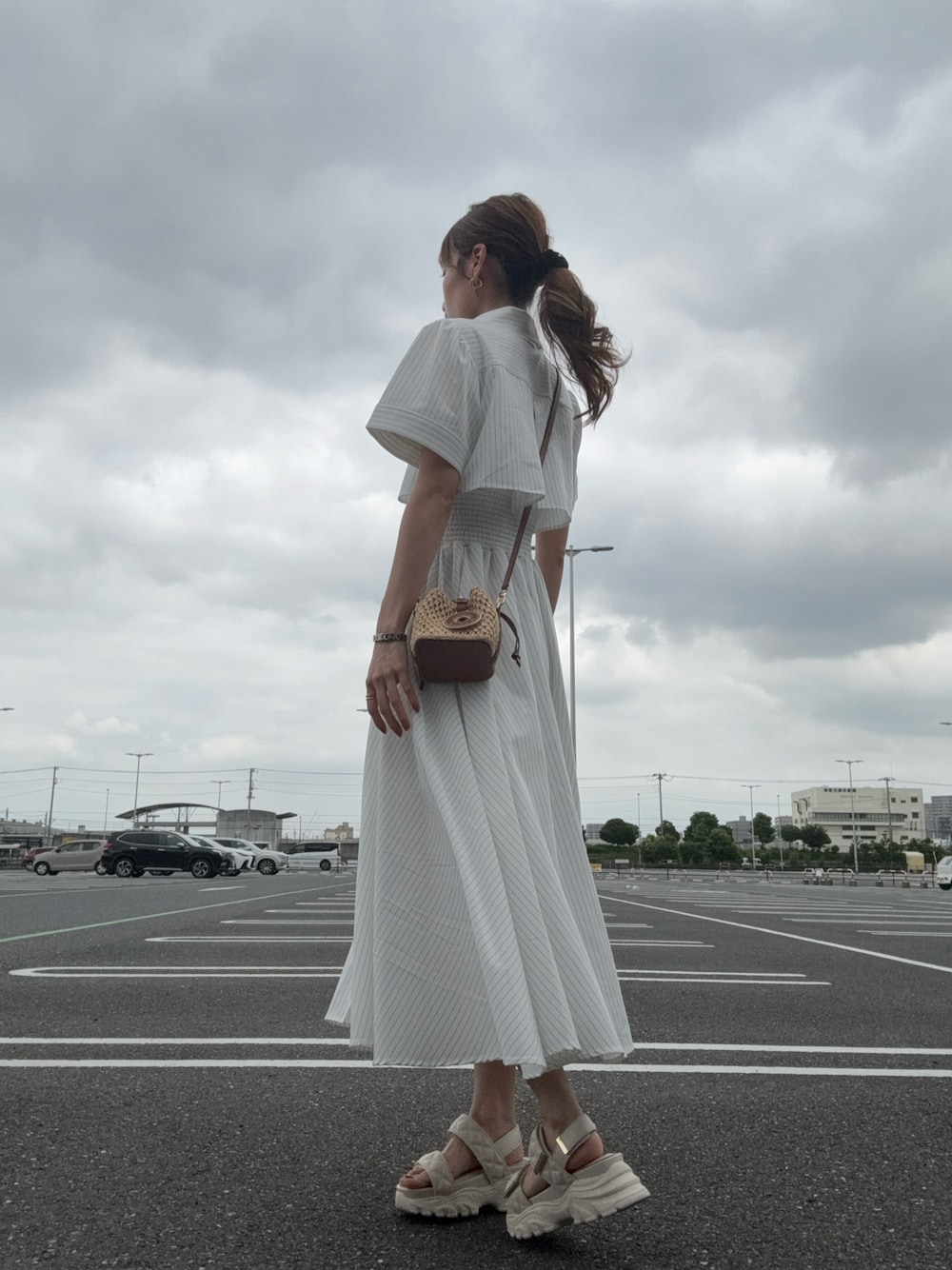 1枚で決まるワンピースってやっぱり好き🥰 だけど思っていたよりもストライプが濃くて、ストライプ似合わないから残念な1着に… サンダルも合わせてホワイトコーデに、ミニかごバッグで涼しげな夏コーデのできあがり🌻