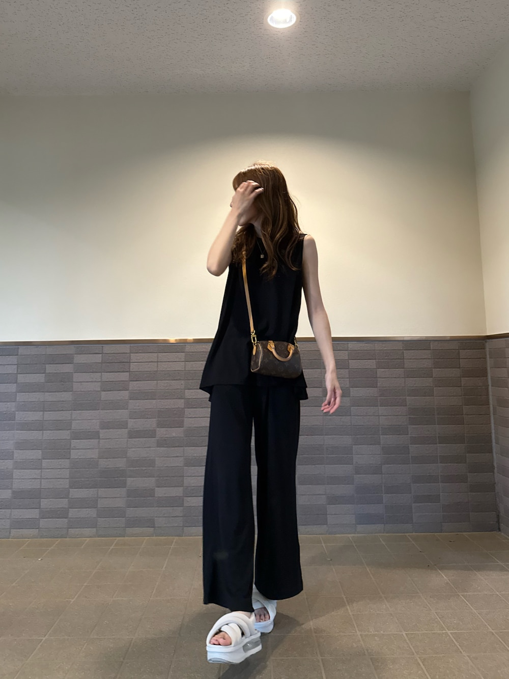 さらっと涼しく着られるセットアップを選びがちな日々… すぐ乾くからすぐ着ちゃう🤫 何考えなくてもきまるからセットアップは便利で助かる🤝 トップスがヒップ丈なのも普段ショート丈ばかり着てるから安心でカジュアルさをおさえられるきちんと感も出るのが◎