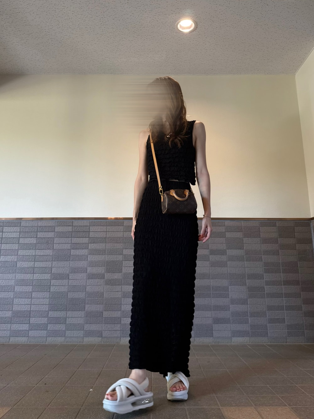 楽ちんセットアップ♡ 簡単におしゃれに見えるのにコーデ考える必要もないし、着心地もポップコーンニットで柔らかくて着やすいからすごくお気に入り◎ だけどニット生地でスリット入れると重みで後ろが伸びちゃって、お家だと床に引きずるほど… スリットない方が良さげ🤫