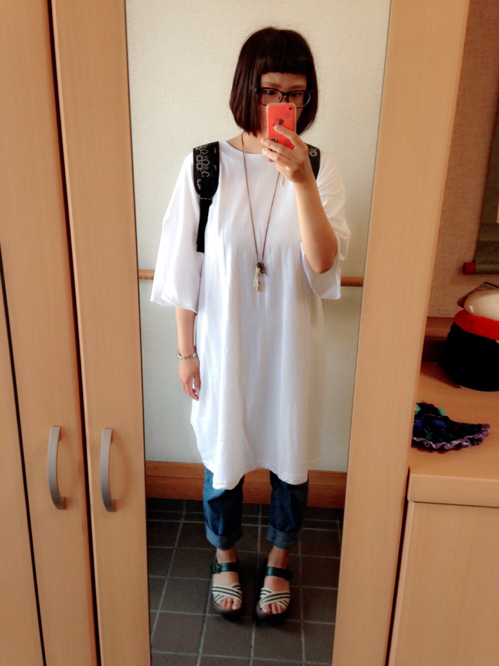 デカTシャツでシンプルに♪ 眼科に行く為今日はメガネ😆 サンダルは今話題のリゲッタカヌー