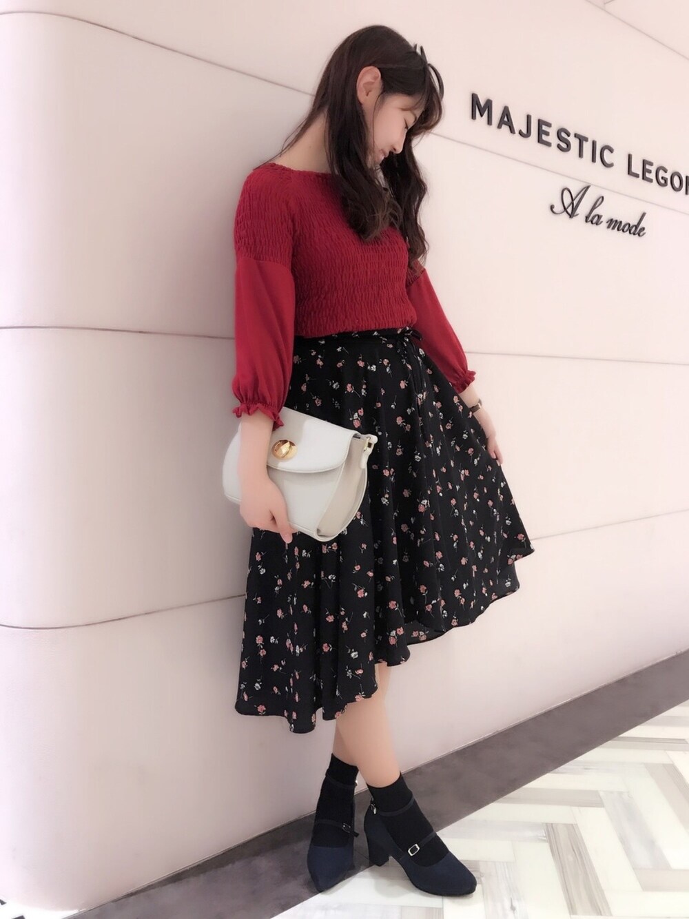 トレンドカラーの赤トップスと ヘムラインスカートを使ったコーディネート。