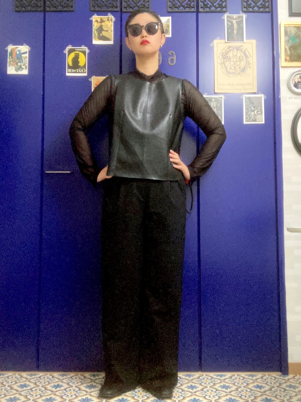 オールブラックコーデです! レザーを一点投入して、同じブラックでも異素材でメリハリを ヘアスタイルは夏木マリさん風マンバンで! 本日は少し強めな見た目にしてみました👊 秋、楽しい!