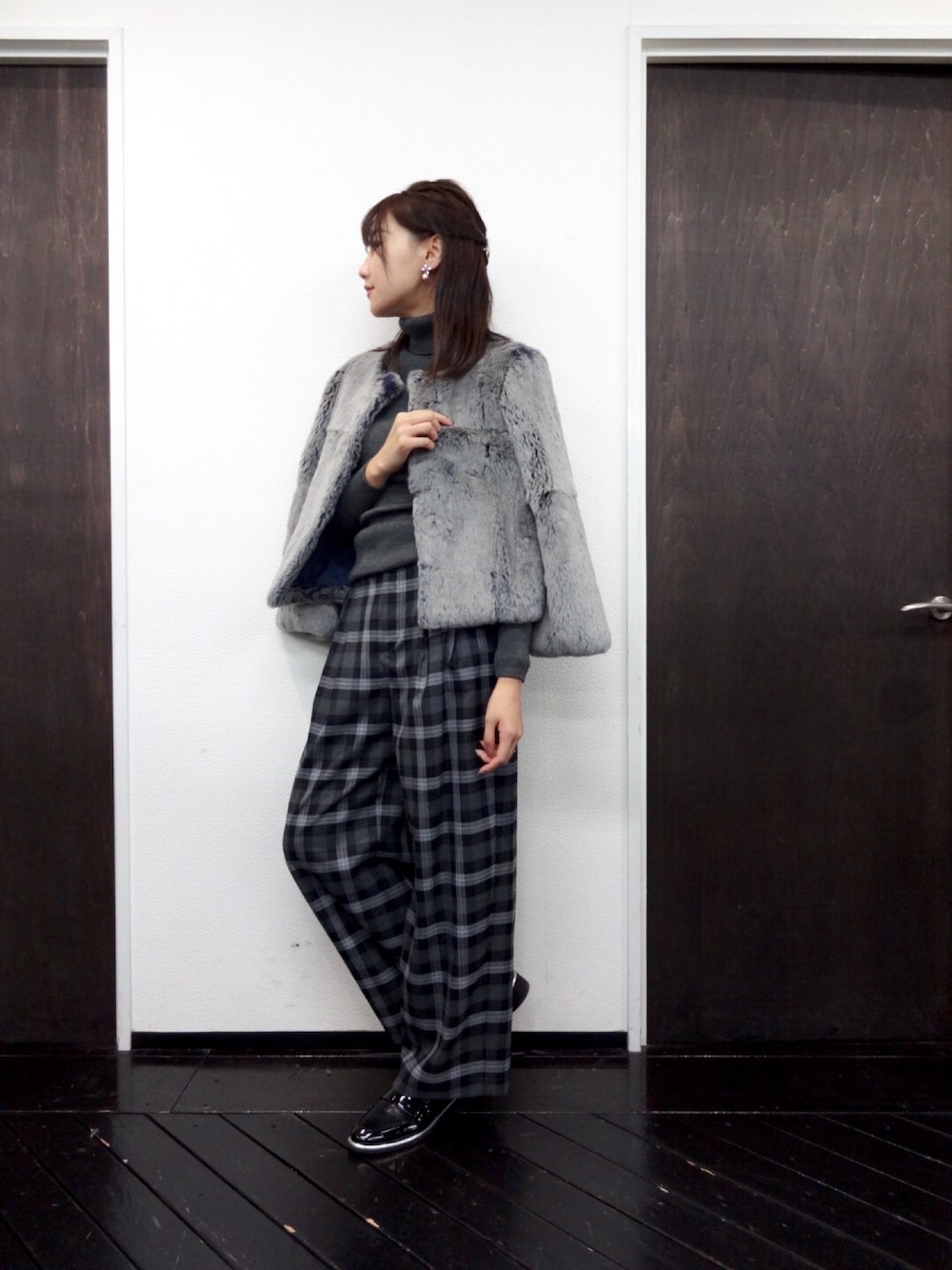 リアルファージャケットにタートルネックニットを合わせ寒い冬もこれならばっちり防寒もできます!!トレントライクな雰囲気漂わすワイドパンツとの組み合わせだよよりgood♪