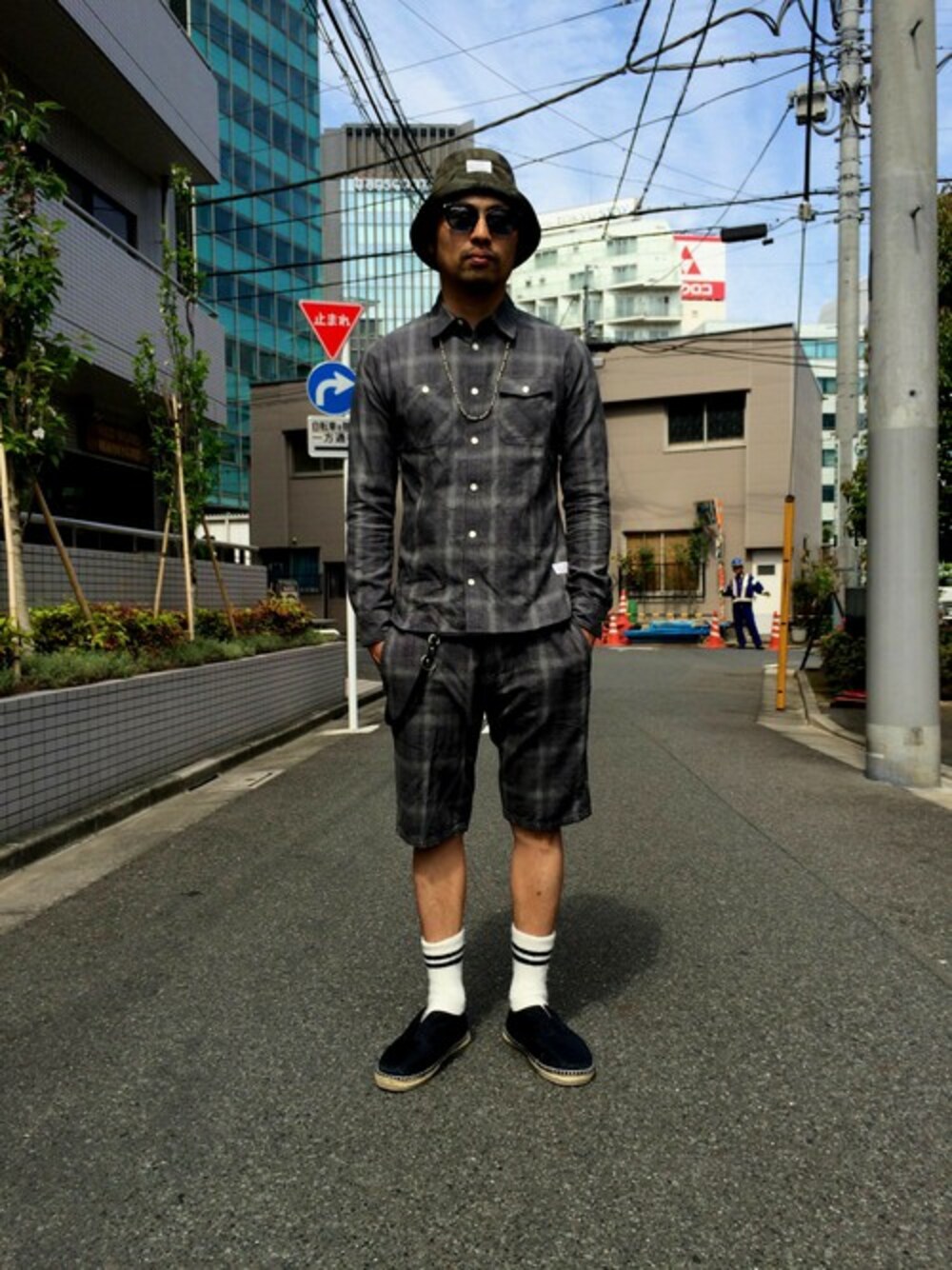 セットアップスタイル。小物はコラボもので合わせています。 ナインテーラー別注ハット、ニューマン別注サングラス、ミソグラフィー別注エスパドリュー、アティース別注ネックレスです。
