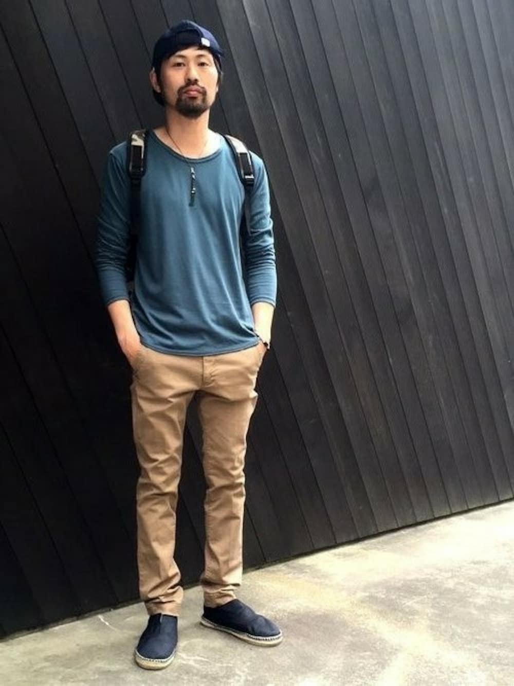 プレーンなコーディネイト。迷彩柄のバッグとフライトジャケット素材のエスパドリーユでミリタリーテイストをプラスしました。