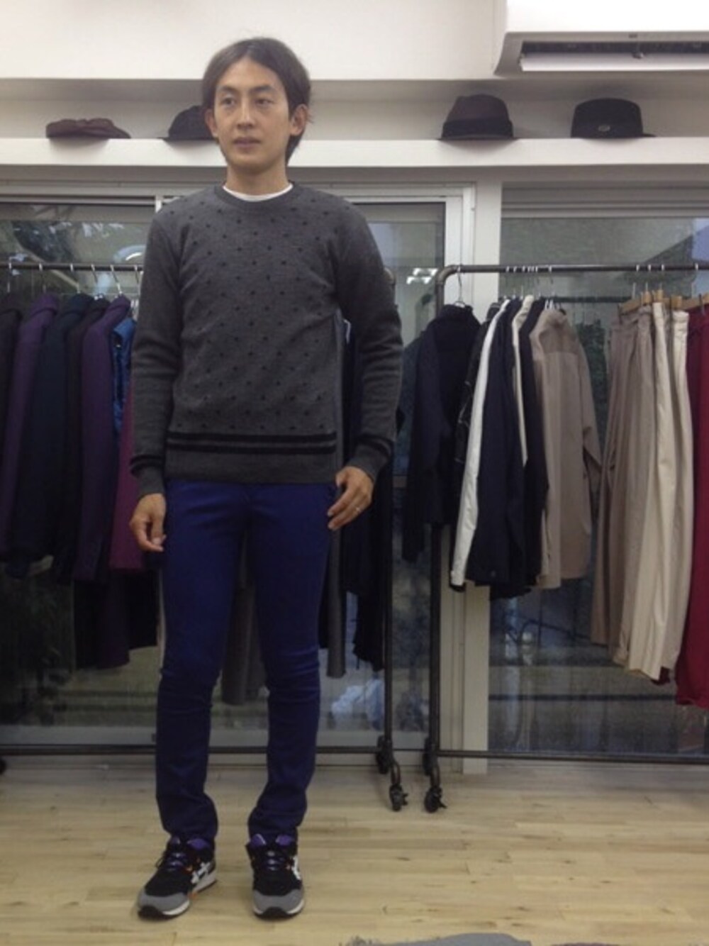 ラインがアクセントのニット。調子良いです。