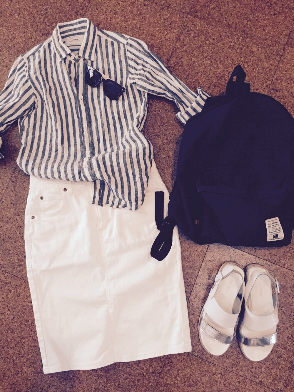 シャツ×タイトスカートの組み合わせをバックパックとスポサンでカジュアルダウン。 TOM FORDのサングラスで引き締め。