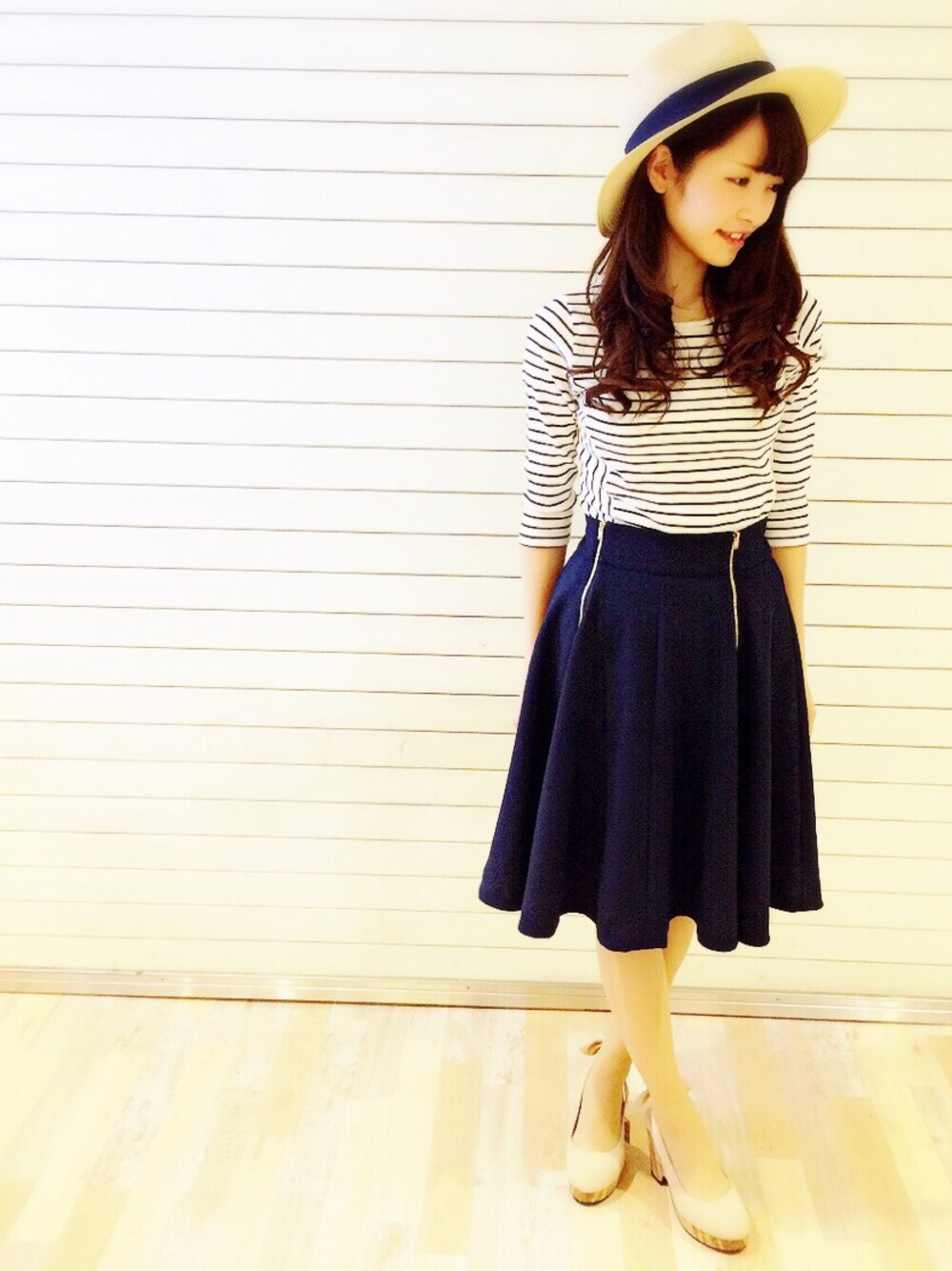 きれいめカジュアルコーデ( ˆoˆ ) 爽やかなボーダートップスに ネイビーのスカートで大人っぽさも 入れてみました♡ パンプスもコルクソールで すっごく軽いので歩き安さNO.1です*