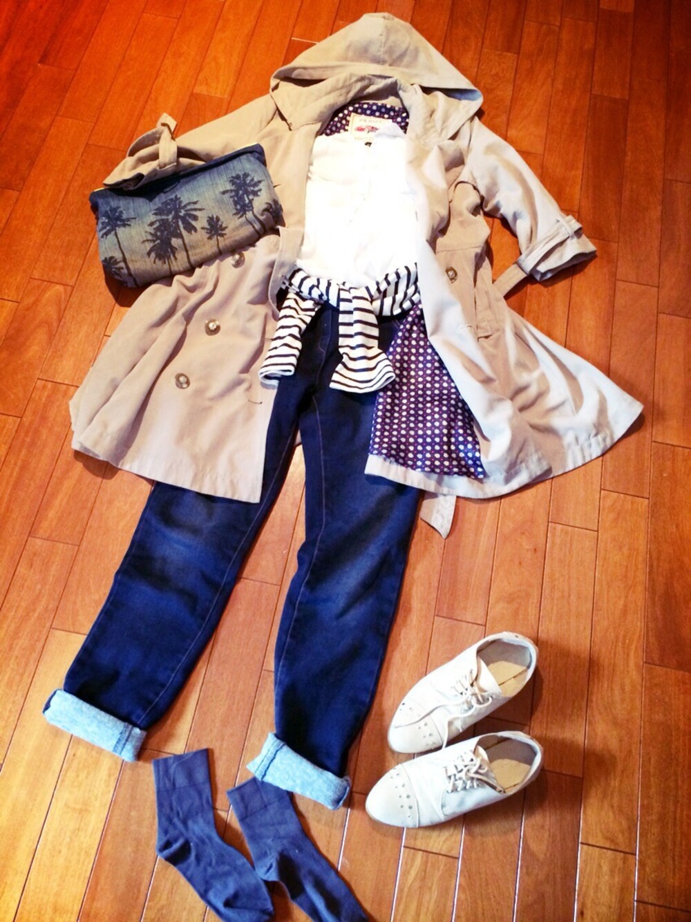 CODEっ\(ϋ)/\(ϋ)/ トレンチコートは、フードがついてて、カジュアルにも着れるのがお気に入りっ♬ ボーダーのロンTを腰巻き◟̆◞̆♩.*⑅