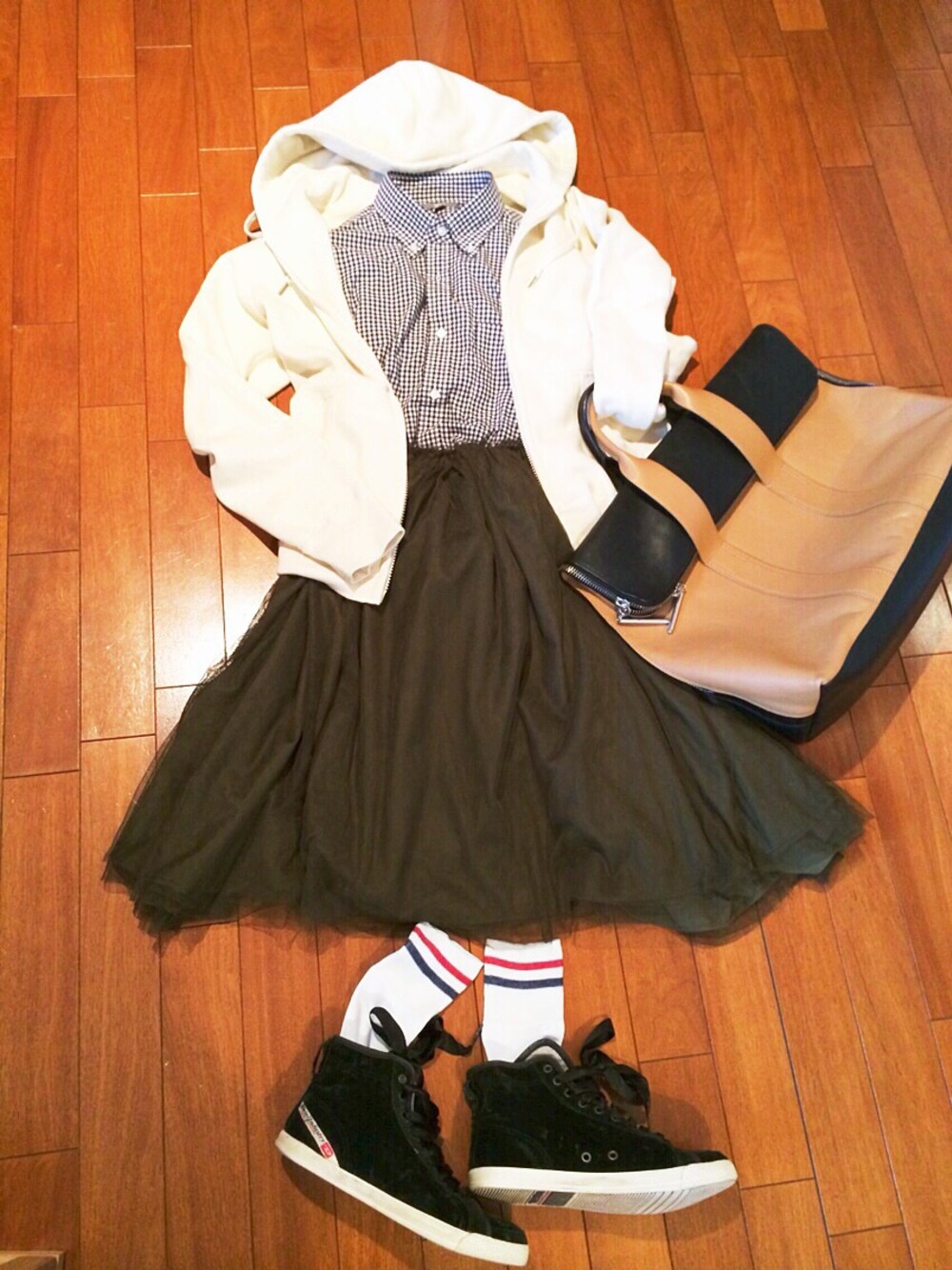 今日は、靴下coordinate♡ この前買った、アメリカンラグシーのん。 チュールsk × チェックシャツ × パーカー 楽チンコーデっ◟̆◞̆♩ カバンは、3.1フィリップリムの。