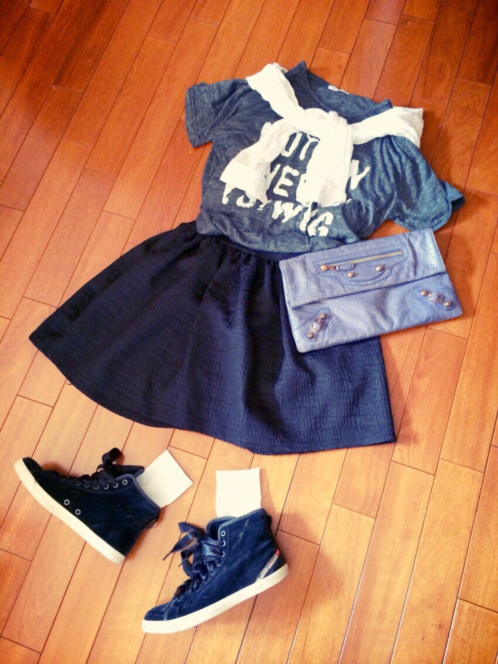 今日は、なんだかモノトーンコーデな気分でしたっ♡♡ プリントT × 黒スカート × 白シャツを羽織りで٩(◜ᴗ◝ )۶ DIESELのスニーカーに白のラメソックス♡ 靴下屋で買った、ラメソックスかわいいー。