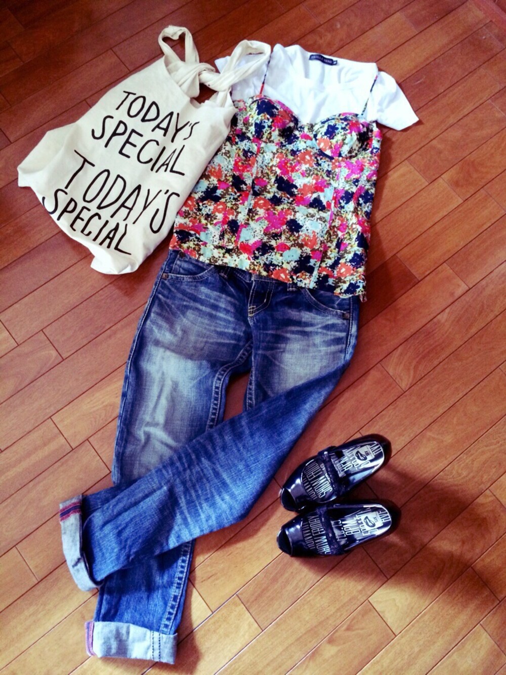 CODEっ\(ϋ)/\(ϋ)/ 今年は、ビスチェがたくさん出てるねー。 前から好きで、結構持ってるので、夏はたくさん使おうーっと♡ 若い子みたいに、単品はムリだから、もちろん重ね着で。 ボーイズデニムは、ヒールをあわせないとバランスがとれないーー! 昔から、デニムだいすきー♡