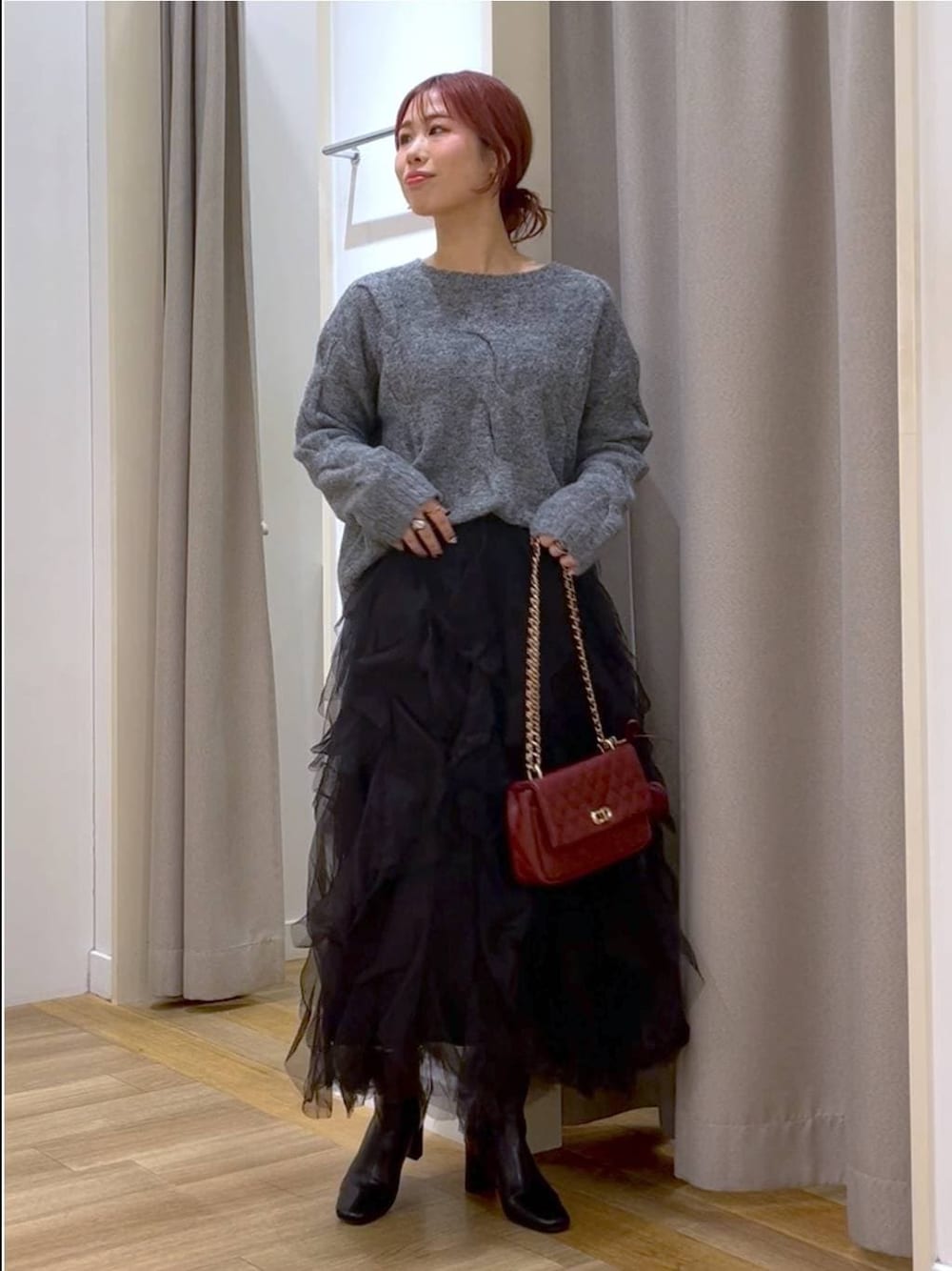 ◼︎ボトムス 主役級のチュールスカート! 縦ラインにチュールが入っているので 横に広がりすぎないので、挑戦しやすいアイテムです! ◼︎トップス 余白の多いケーブル編みなのでシンプルすぎない ポイントのニット! 軽い着用感嬉しいアイテムです!