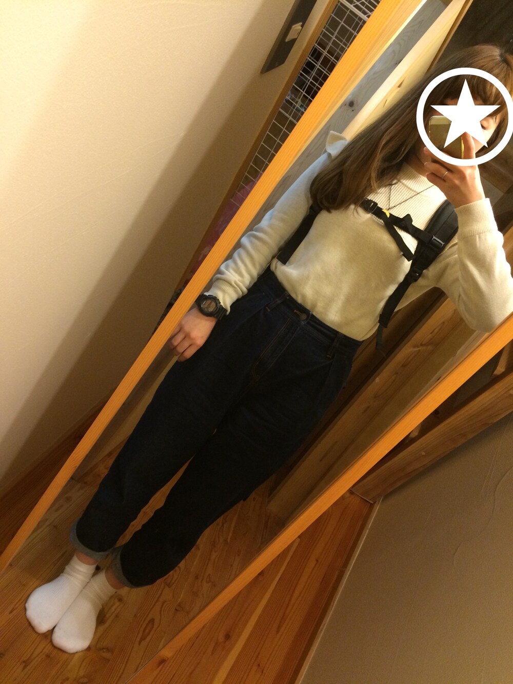 today's code( ˊoˋ ) 。゚ 今日はお仕事休みで 友達とからおけ〜!! ラフすぎる格好🐻 そして着まわしもいいとこ〜 だから愛用バックパックも 背負って撮ってみた💘💘