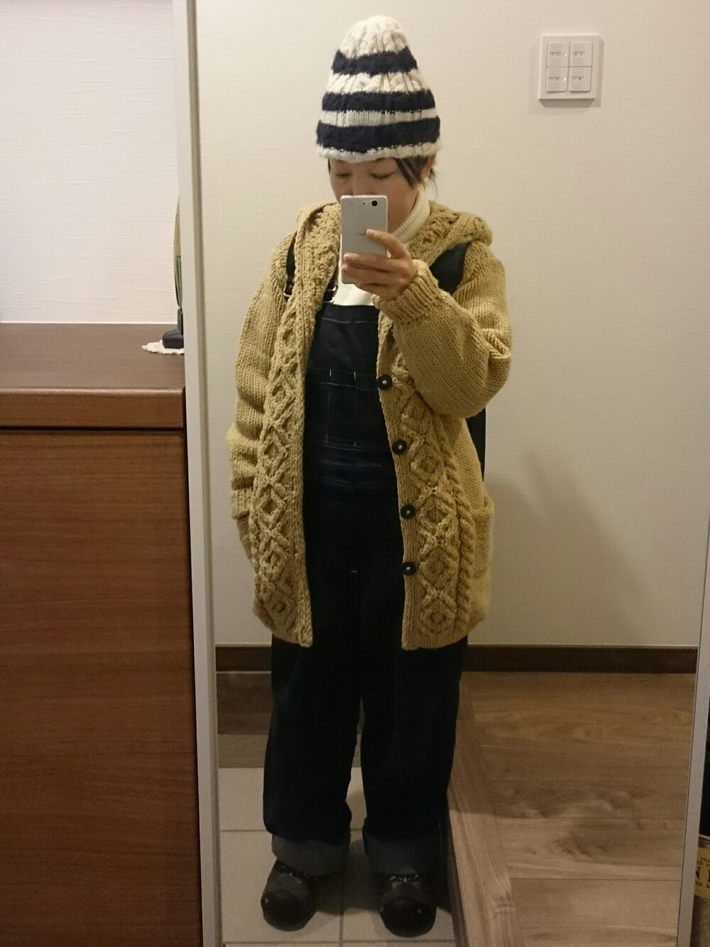 1/14 ☀ 9-3℃ 今日は朝から息子の診察やったんですけど…寒かったぁ❄💦 空気がひんやり澄んでて冬❗て感じでした☺ 天気いいし、窓際で日向ぼっこしよ☀ grinのペルーニットカーディガン 無印良品のタートルニット deepblueのオーバーオール