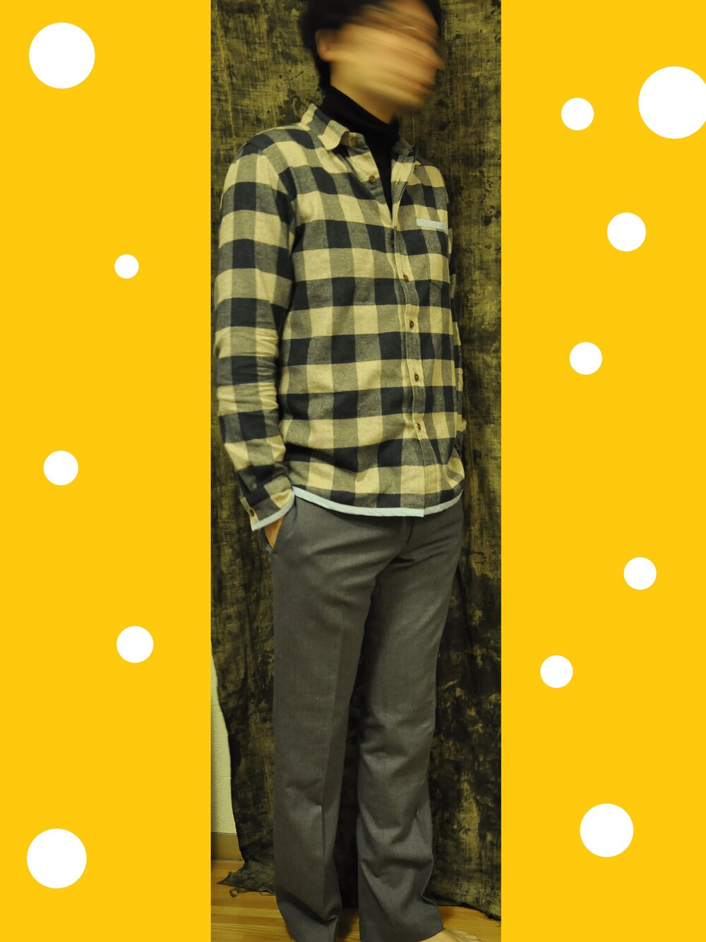 少し大き目のタートルネックにチェックシャツとウールパンツで秋らしく! チェックシャツやけど中にタートルネック着たらちょっと大人っぽくなりました。