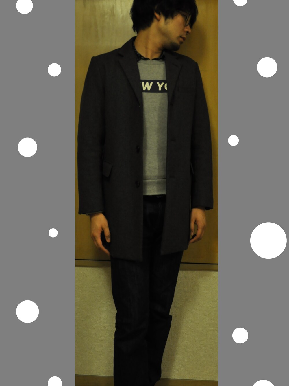 ちょっとふざけたデザインのスウェットの下にドットシャツでバランス取って 上からベターにチェスターコート羽織って「ハイ完成」 このスウェット、裏起毛でかなり暖かいしこれからの季節にピッタリです。