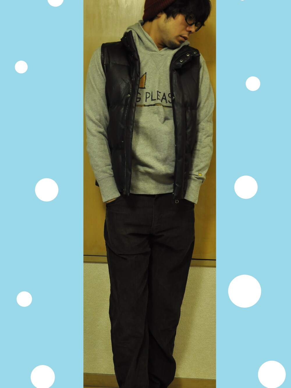 今日はかなりカジュアルな服装で! プルオーバーパーカー×ダウンベスト 最近あんまりこうゆう格好しなかったな~。