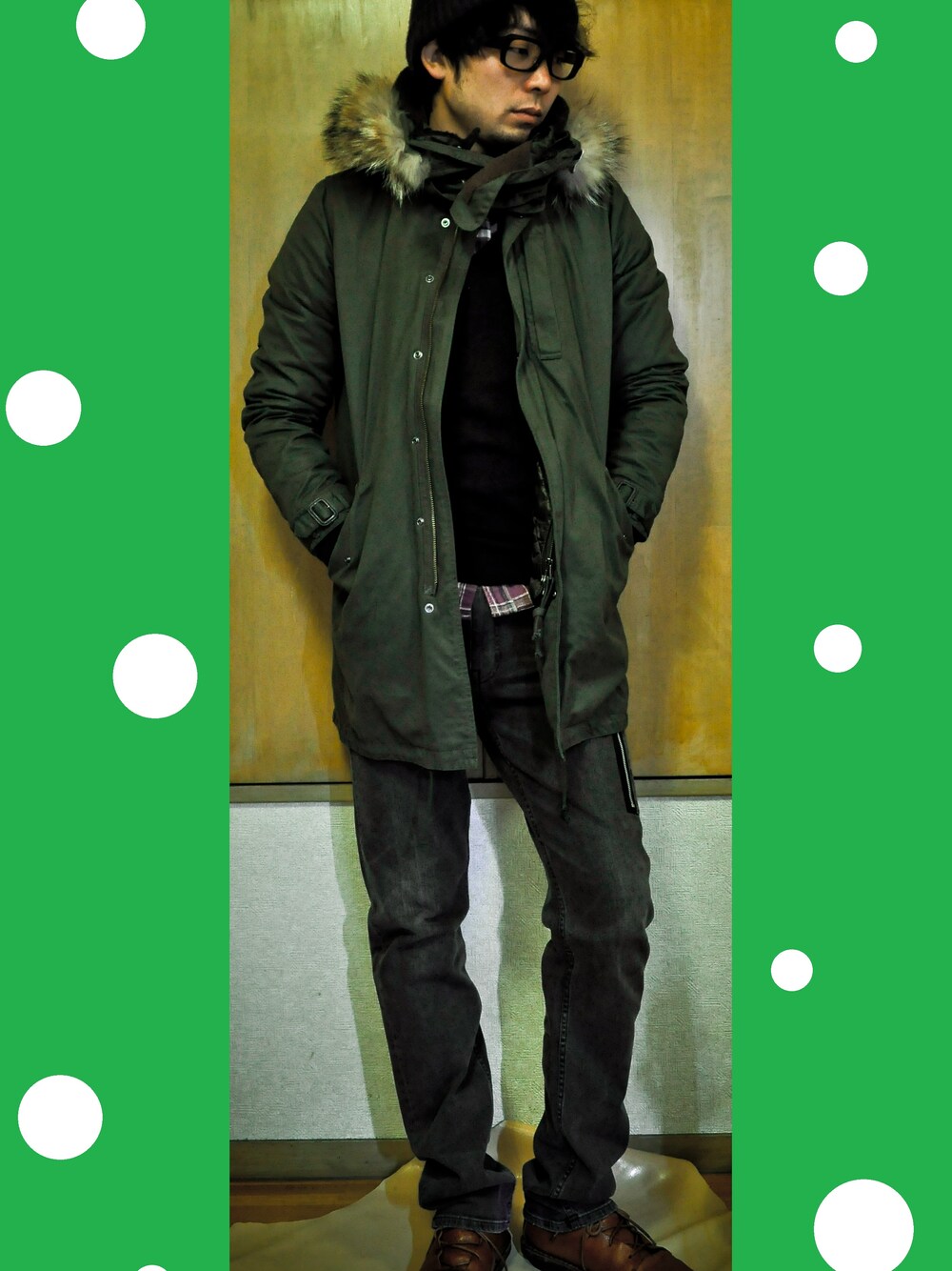 モッズコート×チェックシャツ×ニットってゆうよくある定番の合わせ方ですけど チェックシャツがクレイジーパターンだったり、 ニットがデットストックのものだったりと ちょっとだけ凝ってみました。