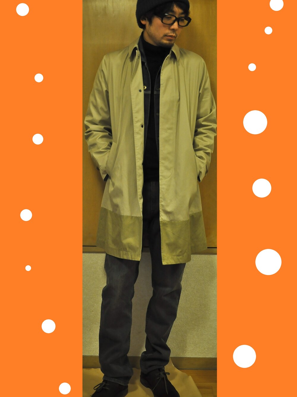 最近タートルネックが好きなんで、それにデニムジャケット合わせて バイカラーのステンカラーコート羽織りました。 足元はデッドストックのmade in イングランドのクラークス ちょっと秋っぽかったかな?何か色合いも写真だと微妙・・・ パンツ何履くかまた考え直そう。