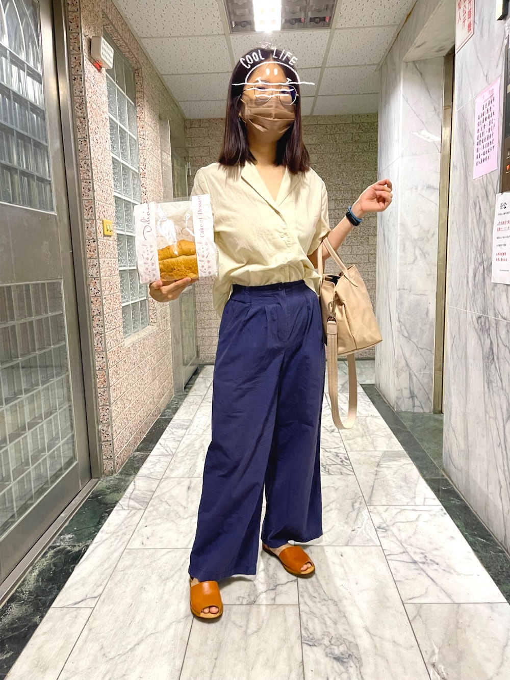 -上班穿搭- 天氣晴🌞午後有雨🌧️氣溫34度 今日心情不錯但是想睡😴 上衣 / @mobo x @maygobla 聯名上衣 下著 / @@mobo x @maygobla 聯名寬褲 包包 / @longchamp 鞋子 / MAGY 口罩/ @jiujiu.tw