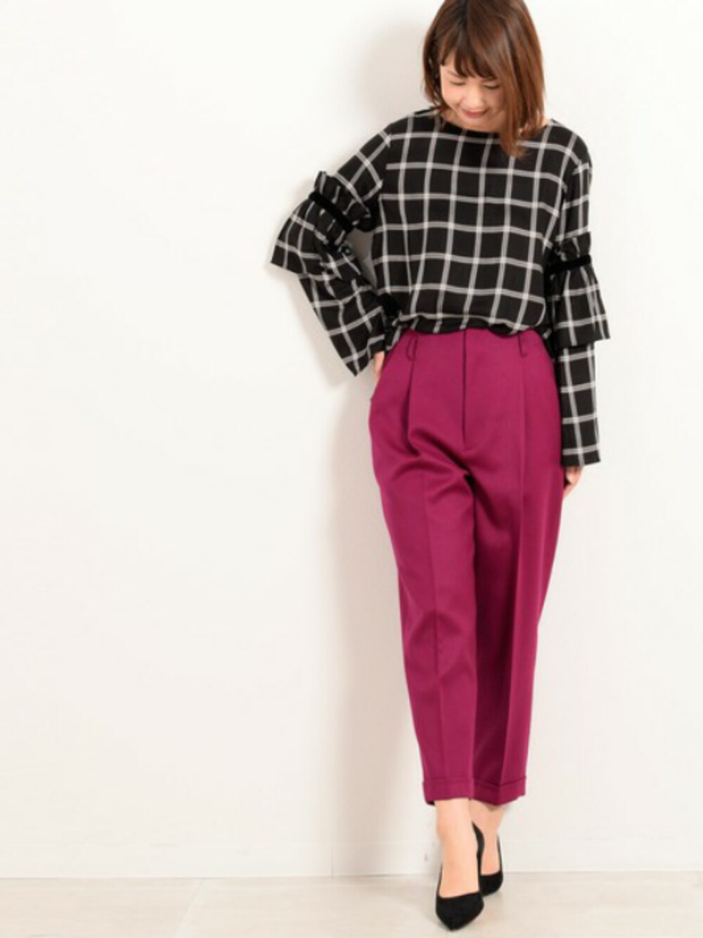 チェック柄のトップスとパープルのパンツで大人っぽいコーデ☆ パープルのパンツは鮮やかな色でとても可愛いです(^_^) スタイルもよく見えました☆