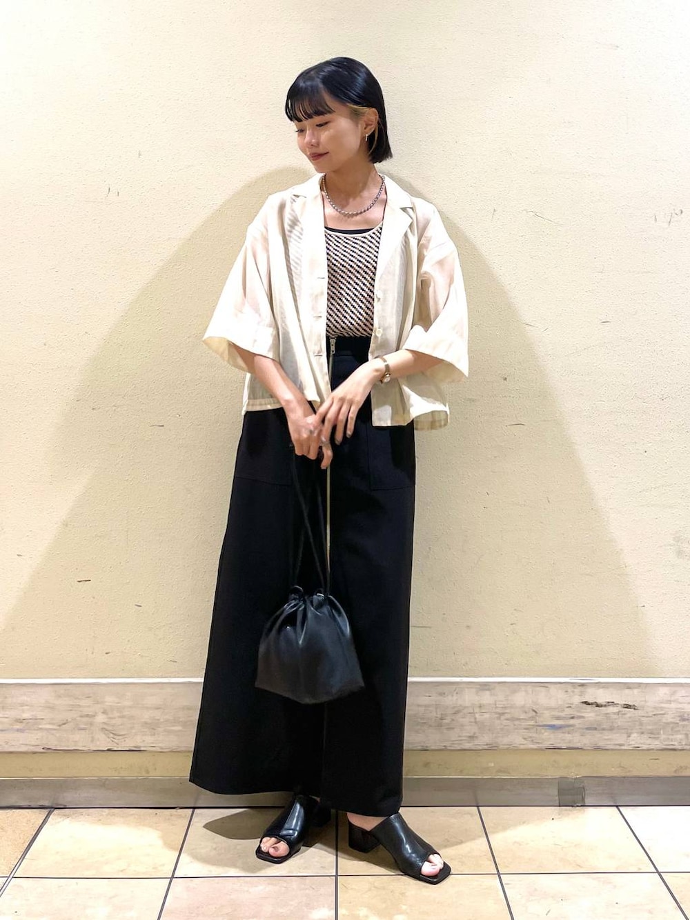 綺麗めカジュアルコーデ♡ シャツは去年も人気だったアイテムで、裾を絞ると丸みを帯びたシルエットになります◎ 程よい透け感なので上品な印象に! トップスが明るめなのでボトムスを暗くしてメリハリのついたコーデにしました^_^